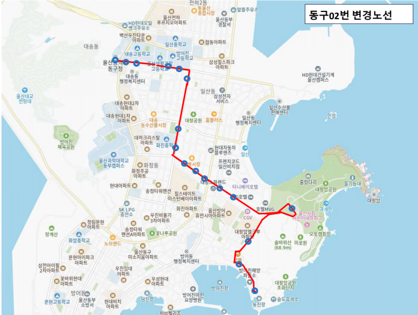 노선변경,신설,폐지 2025년 11월 29일부터 동구02번 운행 경로가 변경됩니다.