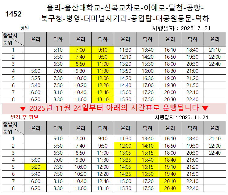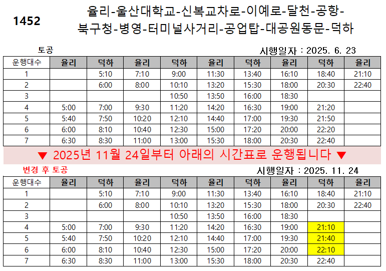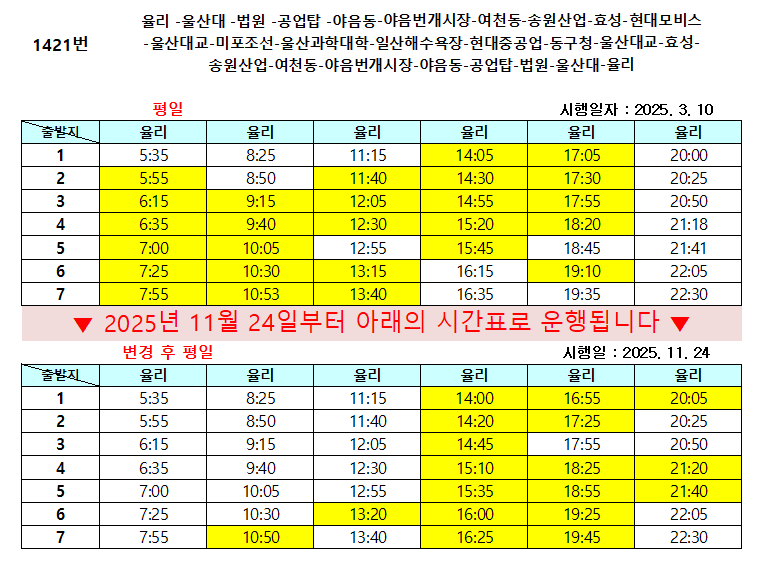 시간변경 2025년 11월 24일부터 1421, 1452번 운행 시간이 변경됩니다.