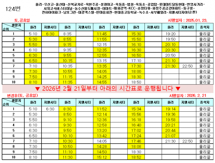 시간변경 2026년 2월 21일부터 124번, 313번, 363번, 513번, 715번, 724번, 1134번 운행 시간이 변경됩니다.