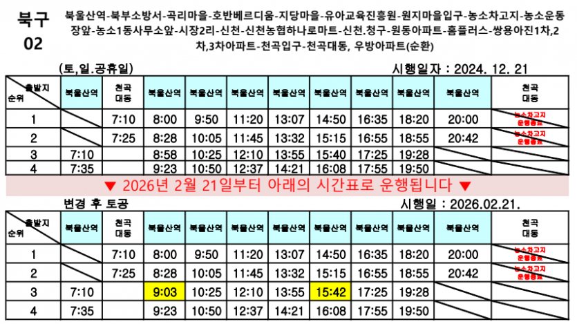 시간변경 2026년 2월 21일부터 북구02번 운행 시간이 변경됩니다. 페이지 정보 작성자 최고관리자 (114.♡.215.204) 조회Hit 140회 작성일Date 26-02-13 10:02 본문 목록 다음글2026년 2월 28일부터 반정삼거리 정류소가 이설됩니다. 26.02.12