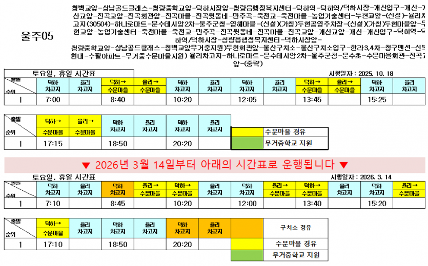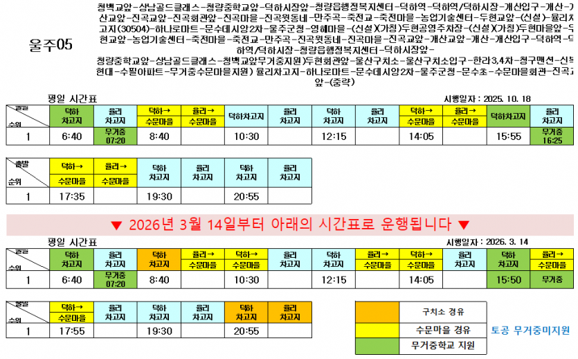 시간변경 2026년 3월 14일부터 울주05번 운행 시간이 변경됩니다. 페이지 정보 작성자 최고관리자 (114.♡.215.204) 조회Hit 181회 작성일Date 26-03-06 13:38 본문 목록 다음글2026년 3월 14일부터 울주05번 지원 노선이 신설됩니다. 26.03.06