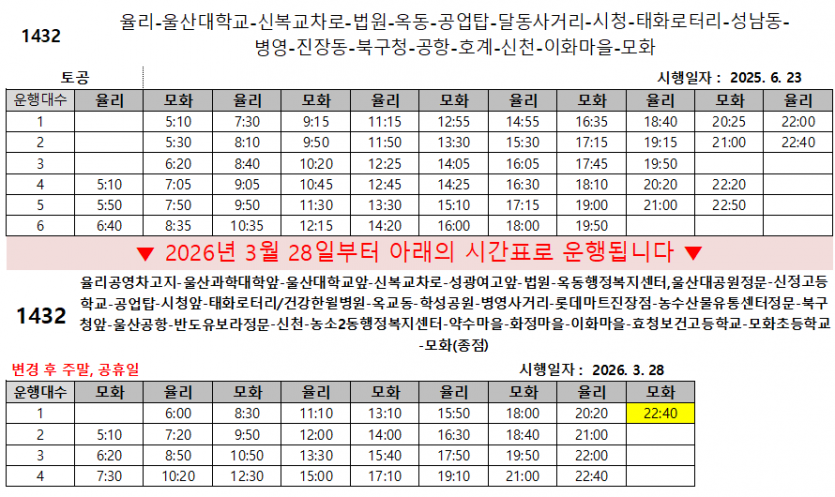 시간변경 2026년 3월 28일부터 1432번, 1452번, 1713번, 1715번, 1723번, 1733번 운행시간이 변경됩니다.